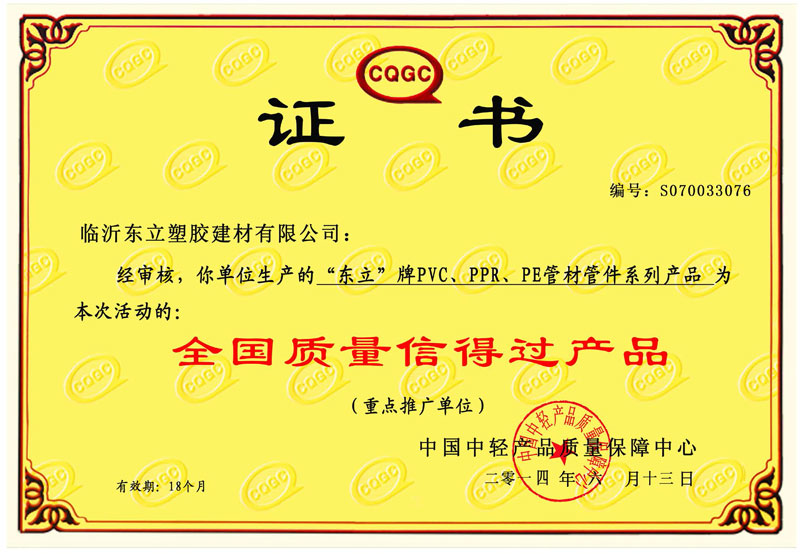 全國質量信得過產(chǎn)品證書